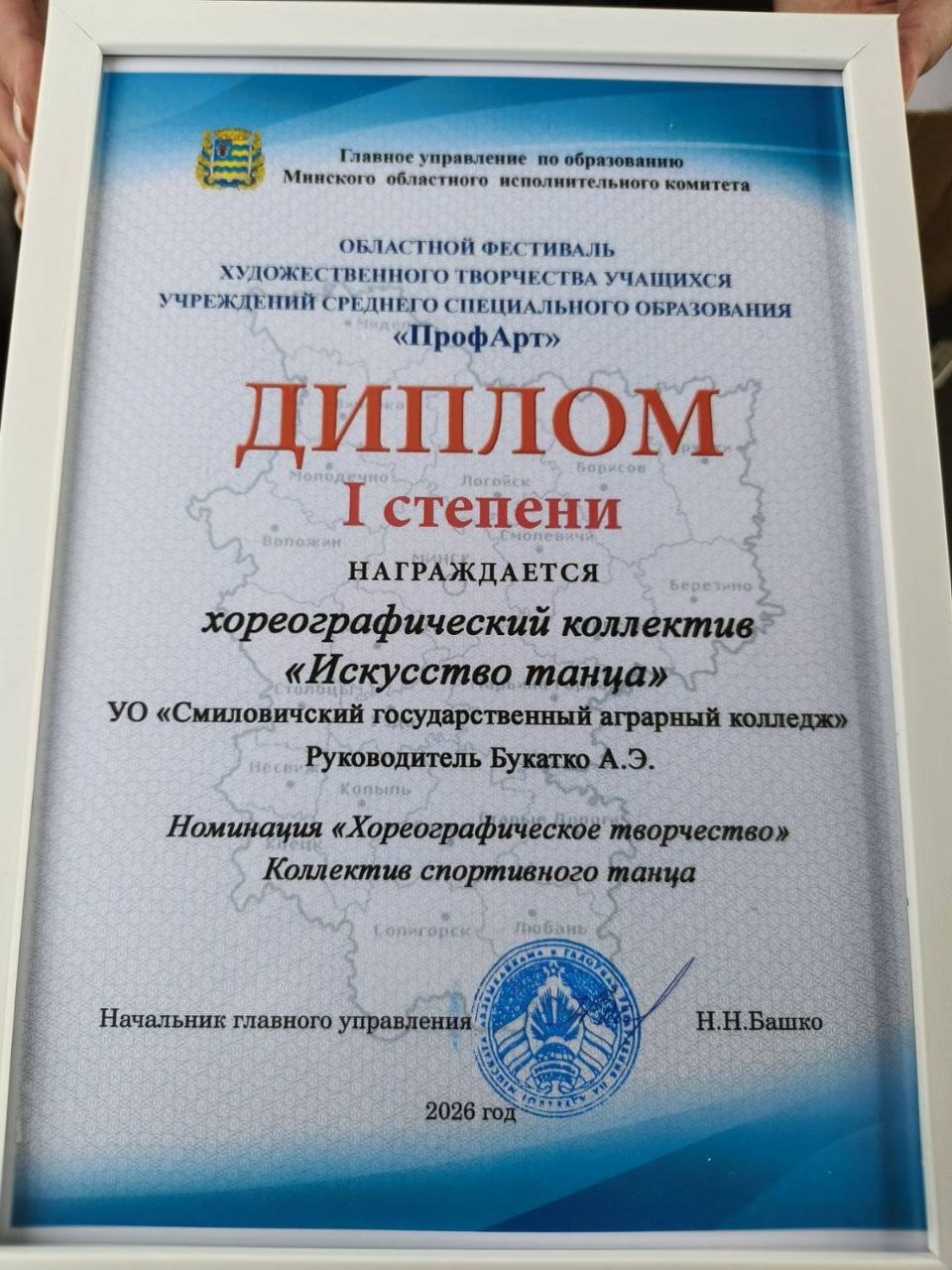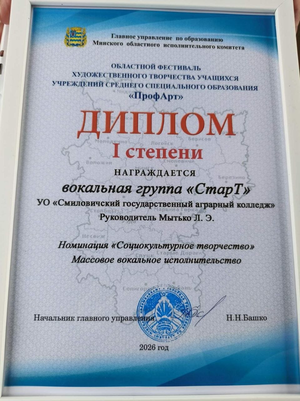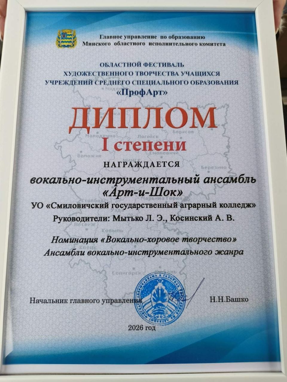 В г.Смолевичи прошли итоговые мероприятия областного фестиваля художественного творчества учащихся учреждений специального образования "ПрофАрт". Творческие коллективы колледжа под руководством педагогов дополнительного образования Лидии Мытько, Анжелы Букатко, Александра Косинского завоевали 8 дипломов 1 степени и 3 диплома 2 степени