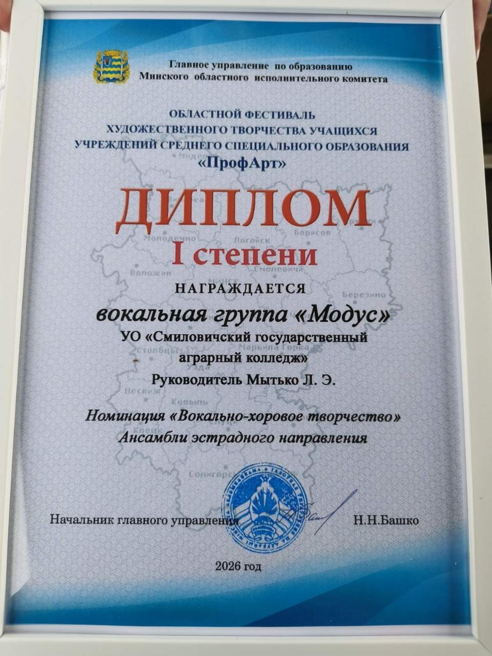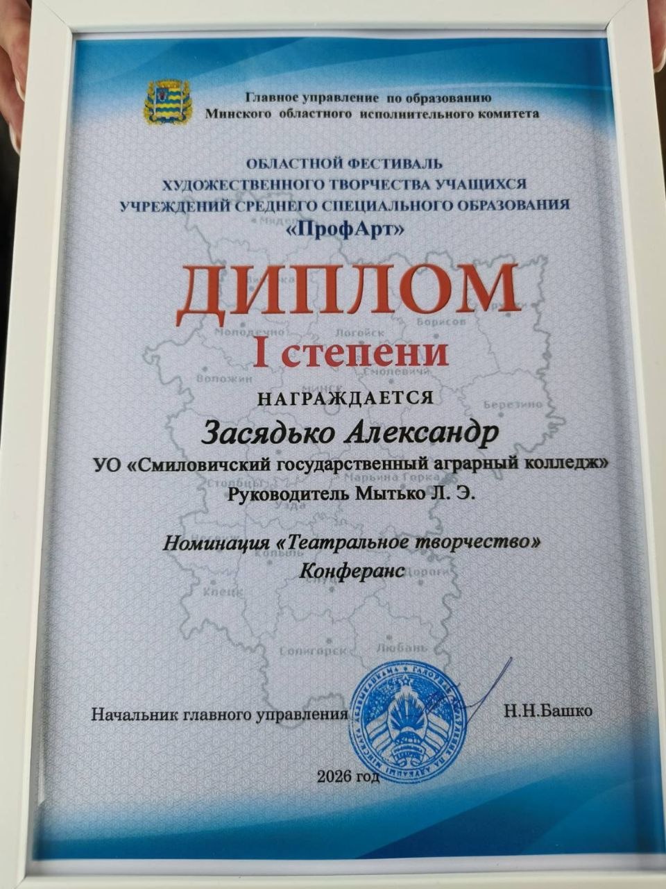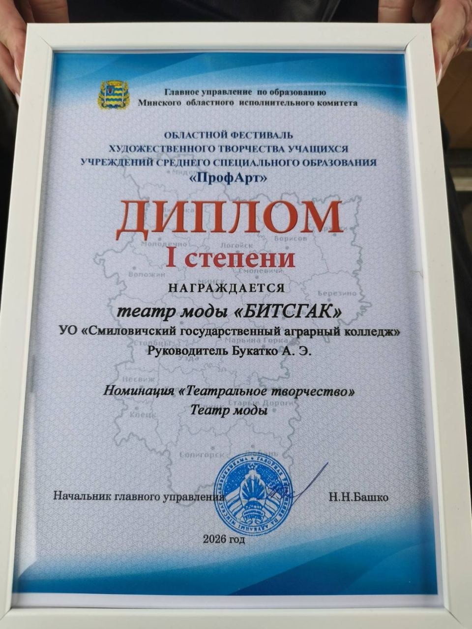 В г.Смолевичи прошли итоговые мероприятия областного фестиваля художественного творчества учащихся учреждений специального образования "ПрофАрт". Творческие коллективы колледжа под руководством педагогов дополнительного образования Лидии Мытько, Анжелы Букатко, Александра Косинского завоевали 8 дипломов 1 степени и 3 диплома 2 степени
